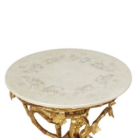 in legno intagliato e dorato con piano in marmo di forma circolare inciso con otto scene di caccia, sorretta da base intagliata e dorata a giorno, a forma di tronco e tralci di vite intrecciate impreziosite da grappoli d'uva e serpente e su base triangolare, profilata da motivo a bacellatura, cm diam. 71,5 x 82
