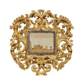 in legno intagliato e dorato, battuta liscia interamente contornata da ricco intaglio a giorno a racemi che dai centri inferiori si portano a quelli superiori ad inquadrare paesaggio su pietra paesina; ingombro cm 19,5x19, luce cm 6,9x8,3