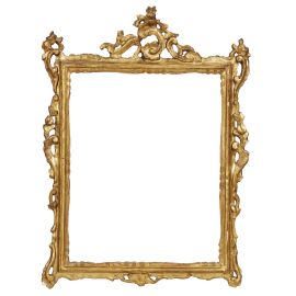 in legno intagliato e dorato, battuta di linea mossa che alterna a piccole orlature incise ai centri e sugli angoli, si porta su fascia che scende in linea modanata, interamente circondata da intaglio rocaille a giorno che impreziosisce gli angoli inferiori, salendo poi sui lati e ornando gli angoli superiori fino alla cimasa; ingombro cm 62x46, luce cm 41x32,8