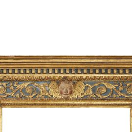 in legno dipinto e dorato, piccola battuta si porta su perlinatura, piccola fascia a gola e profilatura a perline e fusarola affiancata da sagoma impreziosita da intagli in foggia di cherubini ai centri ed agli angoli intervallati da motivo di girali continui su fondo blu e circondata da decoro a baccellatura, culminante in frontone aggettante sotteso da fascia modanata e dentellata; ingombro cm 210x195, luce cm 140x108