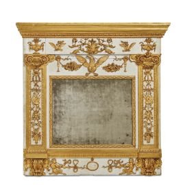 in legno intagliato, laccato e dorato, di forma architettonica, specchiera affiancata da paraste decorate con trofei dorati che si intrecciano a racemi e maschere, terminanti in capitelli ionici sui quali poggiano vasi di fiori, sormontata al centro da grande aquila e sottesa da medaglione affiancato da satiri che suonano il corno, cm 173x177,5x14