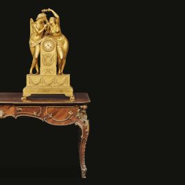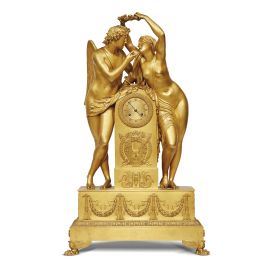 in bronzo dorato, cassa a piedistallo nella quale si inserisce il quadrante di forma circolare con numeri arabi e doppio foro di carica firmato in basso GITEAU PALAIS ROYAL N. 110 sottesa da fregio Impero a due torce incrociate entro una lira sotto al quale due cigni inquadrano un vaso, alla quale si appoggia Psiche in atto di incoronare Amore con una ghirlanda di rose, su base a parallelepipedo ornata da decoro a torce collegate da festoni sotteso da cornice a palmette e terminante in piedini a zampa leonina, due tiretti su ogni lato per il trasporto, cm 96x57x29