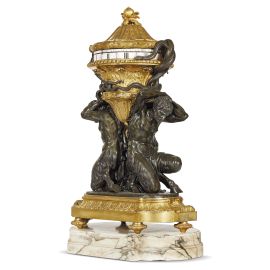 in bronzo brunito e dorato, a forma di grande urna con prese in foggia di serpenti intrecciati e coperchio con presa a melograno, sorretta da due figure di satiri inginocchiati entro base sagomata poggiante su ulteriore base in marmo; meccanismo di forma circolare con indicatore centrale, cm 121x70x40