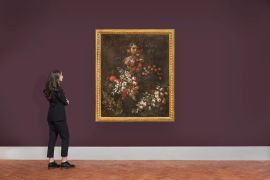 NATURA MORTA CON FIORI E STATUA CLASSICA