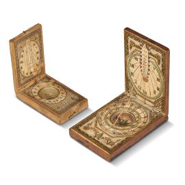 ciascuno in legno rivestito in carta stampata e costituito da due tavolette incernierate con apertura ad angolo retto; sulla faccia esterna del coperchio sono indicate varie città con le rispettive latitudini; l’interno del coperchio presenta invece le latitudini, ciascuna delle quali presenta un foro nel quale inserire il filo che, legato all'estremità opposta della base, costituisce lo gnomone la cui ombra proiettata consente di leggere l'ora; all'interno entrambe le facce presentano diversi quadranti orari e una bussola, necessaria per orientare il filo rispetto all'asse terrestre in modo da ottenere una lettura corretta dell'orario; cm 1,7x6,4x9,8 e cm 1,8x4,7x7,9, la seconda firmata Stockert a Bavaria