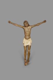 Tuscan sculptor close to Masseo Civitali (Lucca, documented between 1486 and 1518) Crucified Christ, polychromed wood statue, cm 97x75 cm