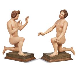 Tuscan, late 16th century, A pair of kneeling nacked young men, carved and polychromed painted wood, 70x26x50 cm