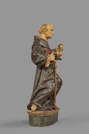 Il cordolo francescano che cinge la tunica monastica, il libro quale attributo spettante ai fondatori degli ordini religiosi, il fusto tornito stretto nella mano sinistra, che possiamo credere costituisse la base di una croce ora mutila, portano a identificare questa figura in procinto di genuflettersi in San Francesco in preghiera davanti all’immagine del Crocifisso. Si tratta di un’iconografia ben radicata nella devozione e nell’arte umbra, ed infatti l’opera appare agevolmente orientabile verso una delle molte prolifiche botteghe d’intaglio ancora anonime attive tra Cinque e Seicento in questa regione, responsabili perlopiù di coppie di Angeli reggicero da altare, simili all’immagine in esame per i tratti infantili e bonari, le acconciature ripartite in ciuffetti vaporosi, e le gesticolanti posture dinoccolate