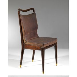 struttura in legno, seduta e schienale imbottiti e rivestiti, puntali in ottone