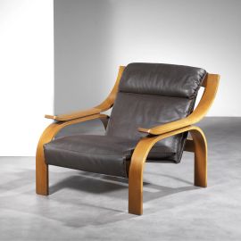 A PAIR OF «WOODLINE» ARMCHAIRS, CURVED WOOD STRUCTURE, BROWN LEATHER UPHOLSTERY SEAT AND SEATBACK