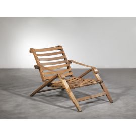 A PAIR OF «WEEK END» FOLDING ARMCHAIRS, WOODEN STRUCTURE, LEATHER BELTS AND BRASS INSERTS