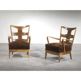 A PAIR OF ARMCHAIRS, WOODEN STRUCTURE, BROWN FABRIC UPHOLSTERED CUSHIONS