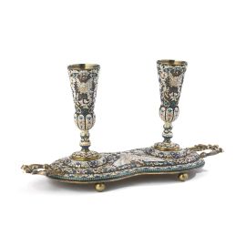 TWO SILVER AND ENAMEL CALIX WITH TRAY, MOSCOW, BEGINNING OF XX CENTURY, ASSAYER IVAN SERGEYEVICH LEBEDKIB
