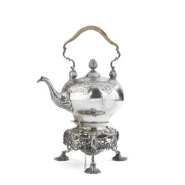 base riccamente traforata con festoni di fiori poggiante su tre piedi sagomati terminanti a larghe foglie; corpo semisferico ornato da volute e fiori incisi, beccuccio mosso, alt. cm 37, g 2075