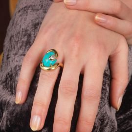 in oro giallo e bianco 18kt, con al centro un turchese taglio cabochon cinto da un serpente impreziosito da diamanti taglio huit huit, punzoni 750 e del fabbricante, mis. 52, gr. 14