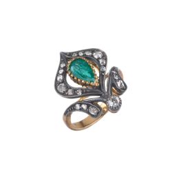 collana ad una fila di perle di mm 8 circa, fermatura in argento impreziosito al centro da uno smeraldo taglio ottagonale di ct 5.70 circa, affiancato da diamanti taglio vecchio per ct 0.20 circa, lungh. cm 55, gr. 42; accompagnata da un anello in oro e argento con al centro di un motivo a volute uno smeraldo taglio a goccia di ct 0.60 circa, circondato da diamanti taglio vecchio per ct 0.40 circa, mis. 55, gr. 6