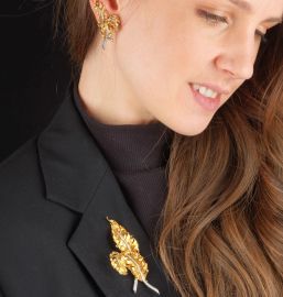 in oro giallo e bianco satinato 18kt, composta da spilla e paio di orecchini a doppia foglia impreziositi da diamanti taglio huit huit per ct 0.60 circa (uno mancante), punzoni 750 e del fabbricante, dim. spilla cm 3x8 circa, dim. orecchini cm 4x3 circa, chiusura a clip, gr. 34 complessivi