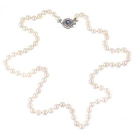 di cui una composta da una fila di perle di mm 7 circa, fermatura a forma di fiore in oro bianco 18kt impreziosita da zaffiri taglio rotondo per ct 0.20 circa, lungh. cm 69, accompagnata da una seconda collana ad un filo di perle di mm 7 circa, fermatura in oro bianco 18kt impreziosita da rubini taglio rotondo per ct 0.40 circa e da un piccolo diamante al centro taglio huit huit, punzone 750, corredata di catenina di sicurezza in oro 18kt, lungh. cm 59, gr. 85 complessivi