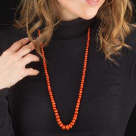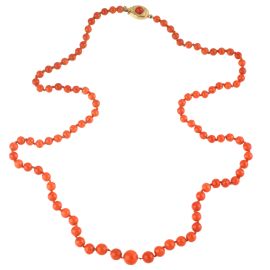 di cui una composta da un filo di barilotti sfaccettati digradanti da mm 10x6 a mm 3x4 circa, fermatura in oro giallo 18kt, punzoni 750 e del fabbricante, lungh. cm 75, accompagnata da una seconda collana ad una fila di sfere in corallo leggermente digradanti di mm 9-4 circa, fermatura in argento dorato, punzoni 925 e del fabbricante, lungh. cm 60, gr. 63 complessivi