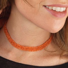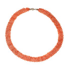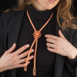 di cui una composta da una fascia di microsfere in corallo rosa di mm 3 circa a maglia tubolare, con al centro un elemento a forma di fiore volto a unire e trattenere la collana, lungh. cm 86, accompagnata da un girocollo composto da microbarilotti in corallo disposti a maglia tessita, chiusura a moschettone in metallo, lungh. cm 36, gr. 76 complessivi