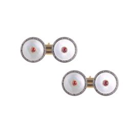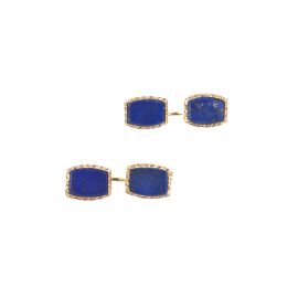 di cui un paio in oro giallo 18kt cesellato, impreziositi da lapislazzuli di forma rettangolare di mm 7x5x2 circa, punzone 18kt, accompagnati da un secondo paio di gemelli in argento oro e madreperla, impreziositi al centro da pietre rosse, punzoni francesi, dim. cm 1x2,5, gr. 12 complessivi