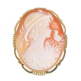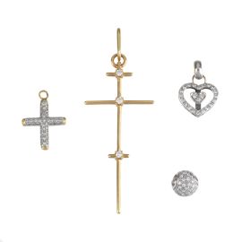 una spillla con cammeo in conchiglia entro cornice in oro giallo 18kt, punzoni 750 e del fabbricante, dim. cm 4,5x5,5 circa, gr. 17, accompagnata da un pendente a forma di crocifisso in oro giallo 18kt impreziosito da diamanti taglio brillante per ct 0.30 circa; un ciondolo a forma di piccola croce in oro giallo e bianco 18kt con pavé di diamanti taglio brillante per ct 0.40 circa, dim. cm 2x2,5; un pendente a forma di cuore in oro bianco 18kt impreziosito da diamanti taglio brillante per ct 0.40 circa, dim. cm 2x2,5; un passante di forma sferica in oro bianco 18kt con pavé di diamanti taglio brillante per ct 0.50 circa, punzoni 750 e del fabbricante, diam. cm 1, gr. 15 complessivi