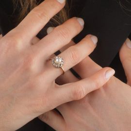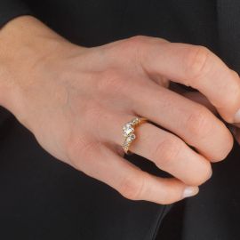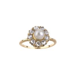 in oro giallo 18kt, di cui uno con al centro una perla di mm 5 circa circondata da una fila di rose di diamante, mis. 50, ed un secondo anello impreziosito sulla sommità da diamanti taglio baguette e brillante per ct 0.70 circa, punzone 750, mis. 53, gr. 7 complessivi