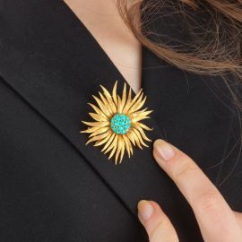 FLOWER-SHAPED TURQUOISE BROOCH IN 18KT YELLOW GOLD