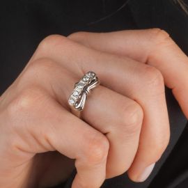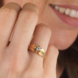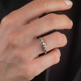 due anelli a riviera in oro bianco 18kt, di cui uno impreziosito da una fila di diamanti taglio brillante per ct 0.50 circa, mis. 54, e un secondo con cinque diamanti taglio brillante per ct 0.20 circa, mis. 57; accompagnati da un terzo anello in oro giallo 18kt con diamante taglio vecchio di ct 0.20 circa, mis. 56, gr. 17 complessivi