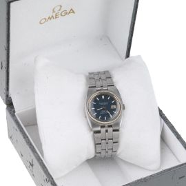 cassa in acciaio, fondello serrato a vite, ghiera zigrinata, corona marcata, quadrante blu firmato Omega, indici applicati, datario a ore tre, movimento a carica automatica, bracciale a maglie in acciaio, lungh. interna cm 15 circa, chiusura a scatoletta firmata Omega, vetro plastica. Diam. mm 27. Corredato di scatola.