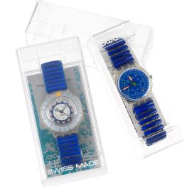 Un orologio Swatch Calendario Completo dalla cassa in plastica trasparente, quadrante blu con indicazione del giorno della settimana e del mese a fori concentrici, movimento al quarzo, bracciale in acciaio con rivestimento a maglie in plastica blu, diam. mm 33. Corredato di scatola e garanzia.