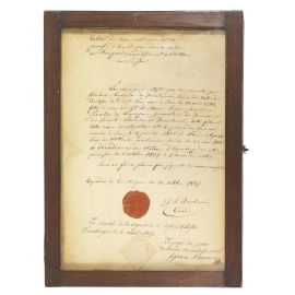 Lot of 2 Napoleonic letters that includes: 1) A signed autograph letter by Napoleon, 2 pages, dated “Paris, le 20 février 1813”, addressed to General Jacques Jean Alexandre Bernard Law de Lauriston (1768-1828) in Magdeburg (during the Russian campaign). In it the Emperor informs the General of the military forces he will find in that city and gives him instructions for their organization. The letter is mounted within passe-par-tout and framed (approx. 370 x 325 mm). 2) A letter in folio in which the death of Ortensia de Beauharnais (1783-1837), Napoleon's stepdaughter, is recorded, dated 12 October 1837, with wax and paper seals, preserved in a wooden box (365 x 267 mm) with front and back glass.