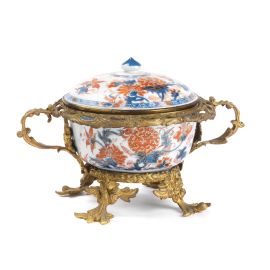 in porcellana bianco blu con “decoro Imari” e montatura in bronzo; alt. cm 18 e diam. cm 28