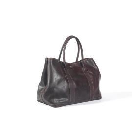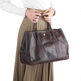 In pelle liscia marrone scuro, con base e fasce in pelle togo con cuciture a contrasto; doppio manico e piccola chiusura in metallo logato a chiusura dell’ampia apertura.