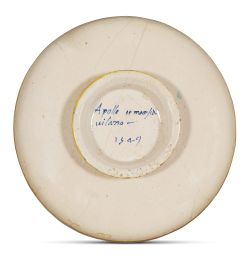 in maiolica dipinta in policromia, coppa circolare su tesa rialzata e orlo arrotondato e listato di giallo, poggiante su piede a calice. Sul fronte è dipinta la scena di Apollo e Marsia e il giudizio del Re Mida. Il pittore tenta di condensare più soggetti nella medesima narrazione con alcune discrepanze nella raffigurazione degli strumenti musicali, mentre il Re Mida è seduto a destra e assiste alla sfida con alcuni personaggi. Sotto il piede la scritta in blu di cobalto “Apollo et marsia / uilano - / 1549. Lo stile pittorico corrivo, che predilige le figure ignude con la muscolatura del torso molto evidente, gli occhi grandi e i tratti fisiognomici marcati, il paesaggio lacustre con monti alti e arrotondati, piccoli alberelli a sottolineare le sponde a tratti marcati avvicinano l’opera alle produzioni del ducato di Urbino ed in particolare alle botteghe attive a Pesaro dagli anni quaranta del secolo, come ad esempio il piatto del museo dell’Hermitage con la morte dei Niobidi; diam. cm 25,3, diam. piede cm 11,7, alt. cm 5,6