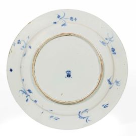 in maiolica dipinta in monocromia blu secondo il decoro noto come “a tappezzeria” con cespi di piante e rocce, centrato da una divinità dell’Olimpo assisa su un carro. Marca sul retro; diam. cm 44,2