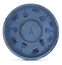 in maiolica dipinta in policromia su fondo berettino con motivo a vaghezze e gentilezze centrato da motivo a trofei. Un confronto prossimo in un piatto dalla collezione Dutuit al Petit Palais di Parigi. Sul retro lettera A in blu cobalto; diam. cm 24,8, diam. piede cm 10, alt. cm 5