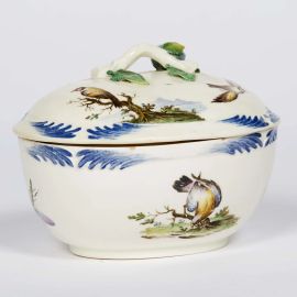 in porcellana tenera, forma ovale con elementi in rilievo a pennellate blu e decoro con piccoli uccelli. Il coperchio ha presa a rametto con un piccolo frutto. Marca della manifattura RF con corona in blu sul fondo; cm 11x14,2x11,2