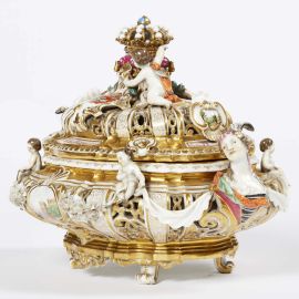 di forma ovale in porcellana policroma e dorata, realizzata secondo il servizio Krönung; coperchio sormontato da una corona sorretta da putti tra quattro cartigli, dei quali i più grandi sono dipinti con gli stemmi degli Elettori di Polonia e Sassonia, mentre sugli altri due sono raffigurate scene di caccia; sul corpo putti a tutto tondo che sorreggono drappi si alternano a riserve dipinte con scene paesaggistiche; le anse sono modellate in forma di busti di fanciulle abbigliate alla moda; interno del coperchio decorato in policromia a motivi floreali; piedini a ricciolo, cm 19x25,2x18