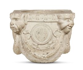 in marmo, bordo ornato a motivo di ovoli ricorrenti entro cerchi intervallato agli angoli da mascheroni scolpiti da cui pendono festoni di foglie, due facce ornate da stemmi, una da medaglione con giglio, una da medaglione con profilo di soldato, cm 41x52x51
