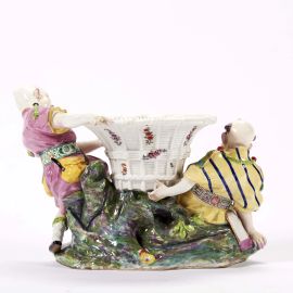 in porcellana policroma, raffigurante due figure esoticge con cestino, recante sul fondo marchio D. V. in rosso, cm 24x36x17