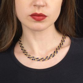 in oro giallo 18kt, composta da una serie di maglie decorate in smalto blu alternate a maglie impreziosite da diamanti taglio huit huit (alcuni mancanti) per ct 0.40 circa, lungh. cm 49, gr. 75
