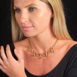 in oro giallo 18kt, composta da una serie di maglie concatenate che formano nella parte centrale un motivo a tralci con smeraldi taglio cabochon per ct 3 circa, punzoni 750 e del fabbricante, lungh. cm 40,5, gr. 53