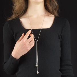in oro bianco 18kt, composta da lunga catena con all'estremità due ciondoli con perle di mm 11 circa e impreziositi da diamanti taglio brillante per ct 0.40 circa, priva di chiusura poiché da annodare sul petto, punzoni 750 e del fabbricante, dim. pendenti cm 1x1,5 circa, lungh. cm 95, gr. 10