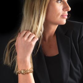 cassa in oro giallo 18kt, fondello a pressione, lunetta in oro giallo 18kt con copertura in oro giallo a forma di fiore traforato ornato da sette diamanti taglio brillante, quadrante argenté firmato Omega, indici e numeri arabi oro applicati, movimento a carica manuale, bracciale in oro giallo 18kt a elementi a forma di fiore traforati e impreziositi al centro da un diamante taglio brillante, chiusura a linguetta in oro giallo 18kt, lungh. cm 18, gr. 52. Diam. mm 15