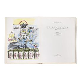 the book contains the text by Alonso de Ercilla y Zuniga, an introduction by Italo Calvino and lithographs in black and in color by Sebastian Matta. Edition: 125 copies of which the first 30 with original drawing in colored pencils by Matta.