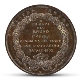 Retro. Ghirlanda di quercia legata in basso da nastro. Iscrizione ALACRI ANIMO. Nel campo dedica posteriore: A – BEARZI – CAV. – BRUNO – L’OPERA – DI S. MARIA DEL FIORE – CON GRATO ANIMO - 1952