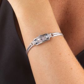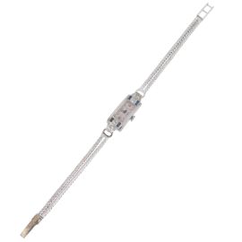 cassa di forma in platino, decorata finemente ai lati con motivi floreali e fogliacei, anse impreziosite da piccoli brillanti e pietre di colore blu, quadrante argenté, grafica nera, numeri arabi, movimento a carica manuale, bracciale a due fili in oro bianco 18kt a maglia tassita, chiusura in oro bianco 18kt, punzone 750, vetro plastica, gr. complessivi 17. Dim. mm 10x23