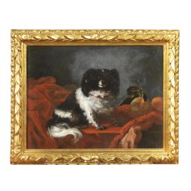 RITRATTO DI CAGNOLINO SU DRAPPO ROSSO