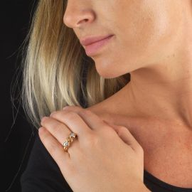 in oro giallo 18kt, impreziosito da diamanti taglio brillante (uno mancante) per ct 0.60 circa, punzoni 750 e del fabbricante, mis. 60, gr. 7